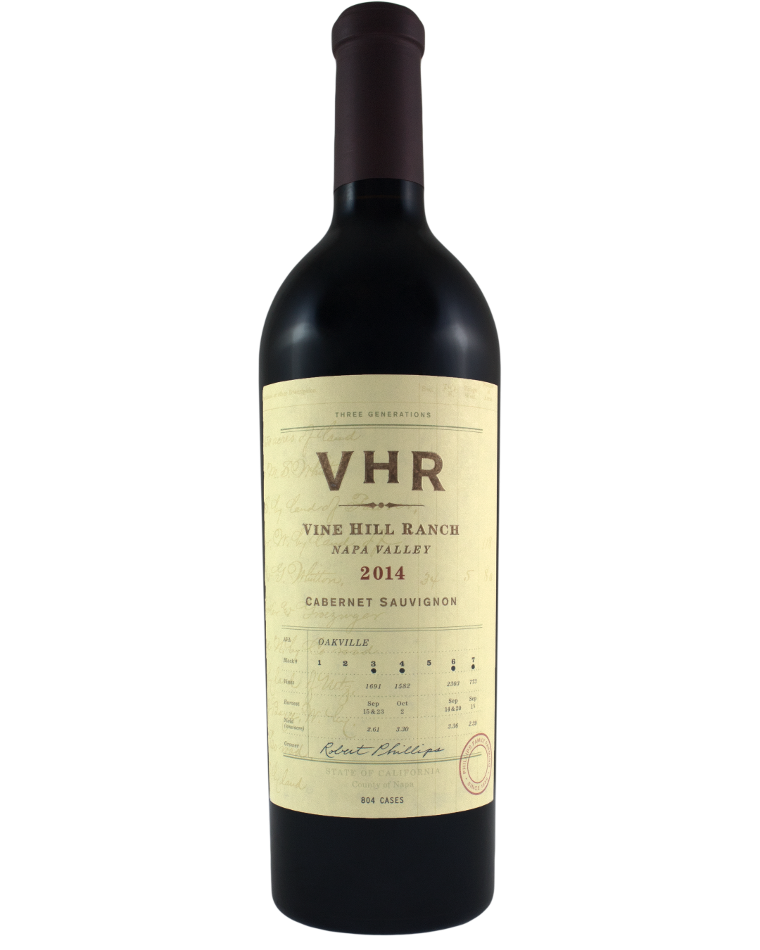 VHR Vine Hill Ranch descends from the foothills of the Mayacamas Mountains into Western Oakville, nestled between the Harlan Estate and Dominus, graced with exceptional soil and climate. Three generations of the Phillips family have cultivated wine grapes here, joining a long line of Napa Valley growers who have farmed these acres since 1884.